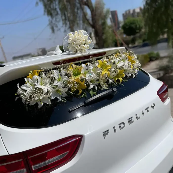 - تزئین ماشین با رز، لیلیوم، ژیپسوفیلا و گلهای فصلی