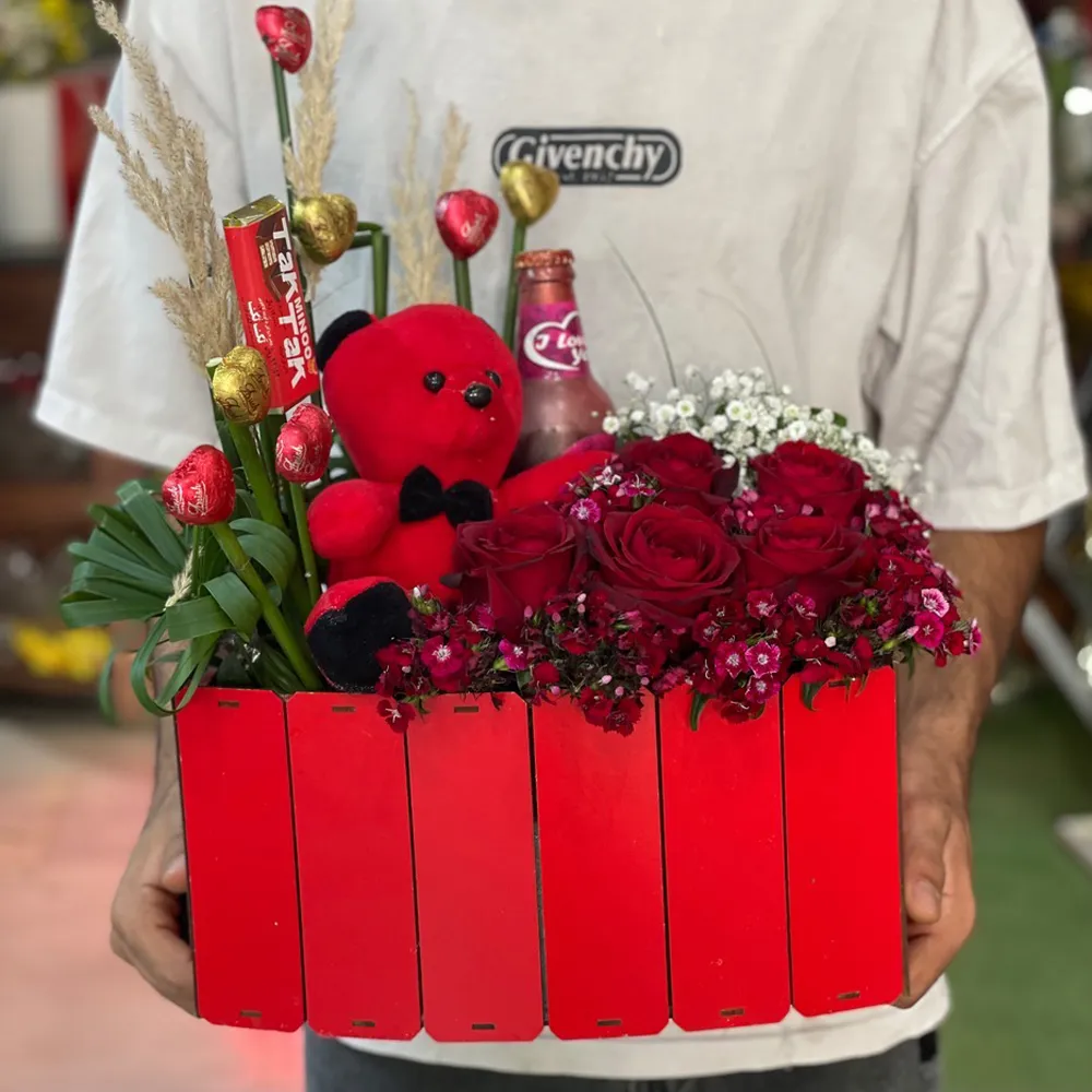 یکی از محبوبترین محصولات ما، باکس ولنتاین قرمز با خرس تدی و گل رز طبیعی است. این باکس شامل: